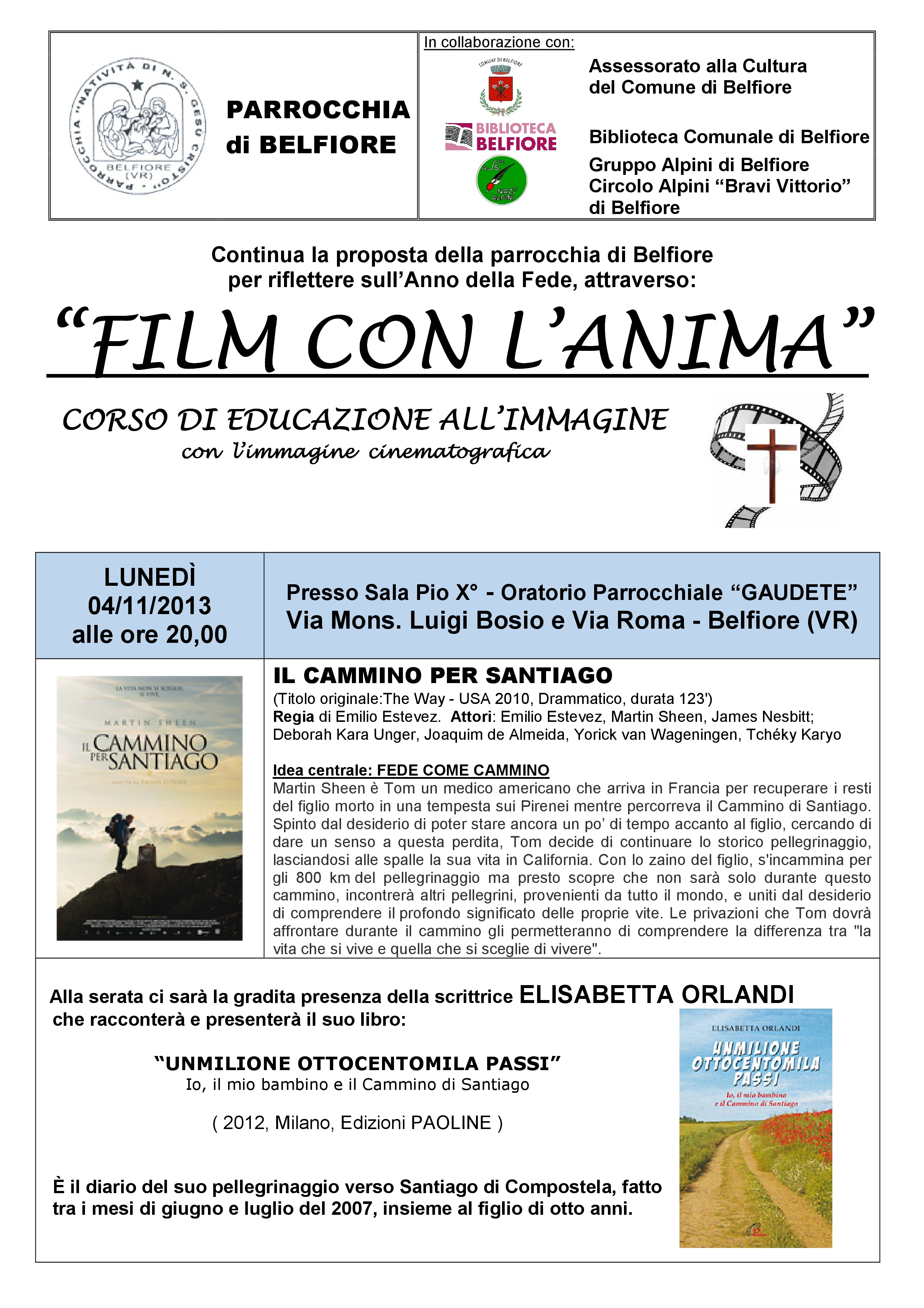 Lunedì 4 novembre, alle ore 20:00, nella comoda sala Pio X (entrata da via Roma) a Belfiore (Vr), racconterò “Unmilioneottocentomila passi. Io, il mio bambino e il Cammino di Santiago”. Poi, comodamente seduti, guarderemo il film “Il cammino per Santiago” e torneremo a casa sognando di partire…